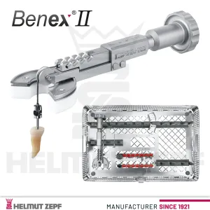 In modern dental treatment, implantology following extraction is increasingly favoured. Consistent with the principle of minimal invasion, conserving soft and hard tissue structures is a must. Due to the longitudinal extraction, the modified Benex® guarantees a gentle and simple extraction of roots in the whole mouth. It is nearly impossible to harm the soft tissue and the surrounding bone.