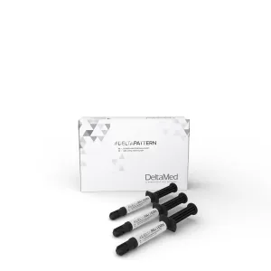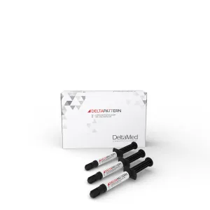 Thanks to being a flow-optimized thixotropic gel, DeltaPattern can be applied precisely out of the syringe, stays in place and does not run. It is suitable for casting as it burns out completely without residue. Due to its slight translucency it allows visual layer control when applying. DeltaPattern is dimensionally stable which allows a tension-free removal. The resin cures in all standard light-curing units (320-500 nm).