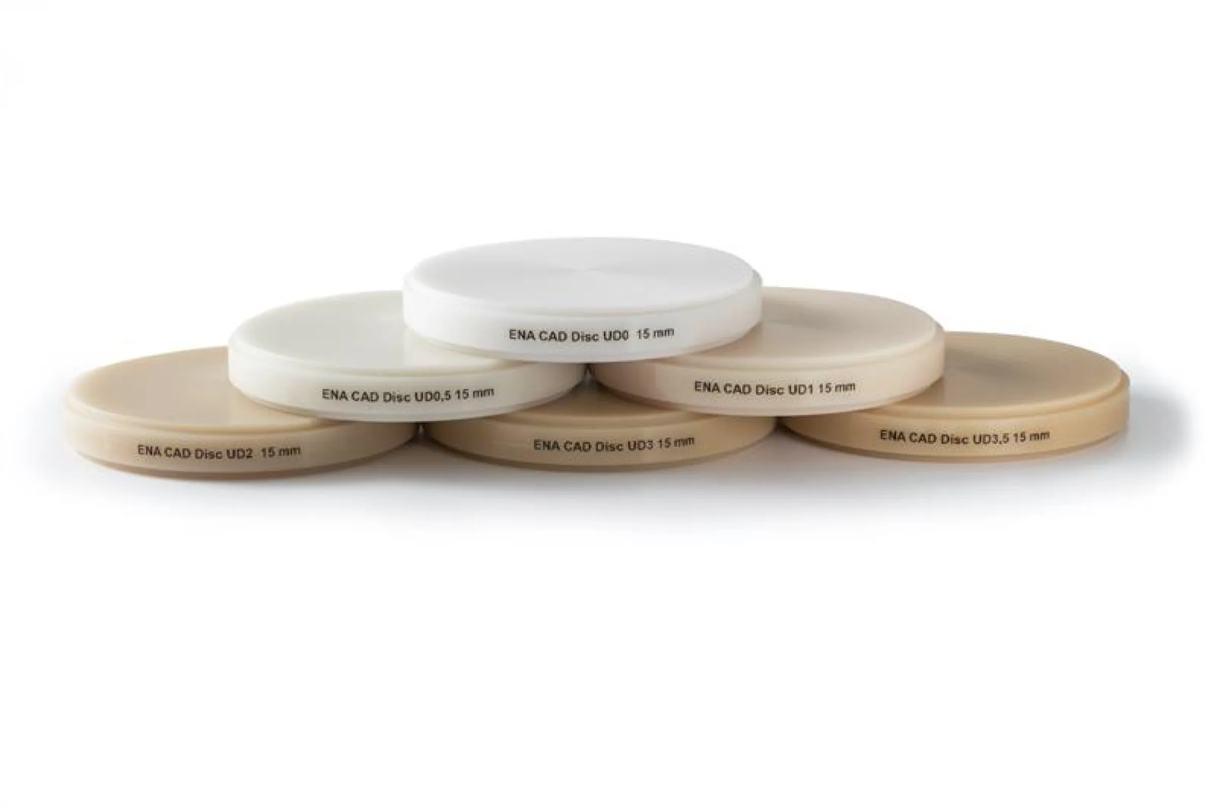 ENA CAD discs and monolayer blocks are available in the following shades: UD0, UD0.5, UD1, UD2, UD3, and UD3.5.